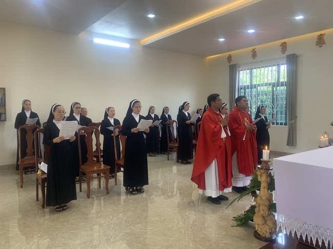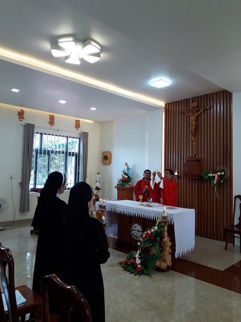 Chị em được mời gọi làm mới lại tâm hồn, được kín múc bao ân sủng Chúa qua Bí Tích Hòa giải. Ân sủng được nhân đôi, vào lúc 10g, chị em lắng đọng tâm hồn tham dự Thánh lễ Suy tôn Thánh Giá tước hiệu dòng cách tích cực và thánh thiêng với ý tạ ơn Chúa nhân “Kỷ niệm ngày Đức Cha Augustin Tadieu Phú ban chỉ thị lập Dòng Mến Thánh Giá tại Giáo phận Qui Nhơn năm 1932” cầu xin ơn bình an cho đất nước, cho Hội Dòng và cho từng chị em. Cha giảng lễ mời gọi chị em  tri ân Đức Cha Lambert Đấng sáng lập dòng. Từ thẳm sâu tâm hồn Ngài phát xuất kinh nghiệm thiêng liêng vì lòng yêu mến Chúa Kitô Chịu Đóng Đinh, để thành động lực chi phối mọi hoạt động từ xã hội đến Giáo hội, từ bên ngoài đến nội tâm của Đức Cha, ngài được Thiên Chúa chúc phúc để có được những thành quả như hôm nay, đồng thời Đức Cha ao ước có thật nhiều người hiểu biết và yêu mến Thánh Giá. Là con cái của Đức Cha được mời gọi sống trọn đặc sủng của mình, khi sống mầu nhiệm Thánh Giá trong đời sống của mình, chúng ta giới thiệu làm chứng cho con người trong thế giới hôm nay về giá trị cao cả của Thập Giá Đức Kitô.  Chúng ta nên hy vọng làm mới lại đời sống tu trì dâng hiến mỗi ngày bằng những hy sinh, những tâm hồn đóng góp, sự  nhịn nhục nơi mình đang phục vụ, nơi được sai đến, để cùng đồng hành với giáo hội, xã hội trong những biến cố lịch sử …. như là quà tặng, để đời sống thánh hiến của chị em trở nên nhẹ nhàng hơn, hạnh phúc hơn. Đây cũng là động lực giúp chị em sẵn sàng dấn thân phục vụ tha nhân như người tôi tá để qua Mầu nhiệm Thập Giá chúng ta được tham dự sâu xa hơn vào mầu nhiệm Vượt qua của Đức Kitô và mang ơn cứu độ cho muôn người.