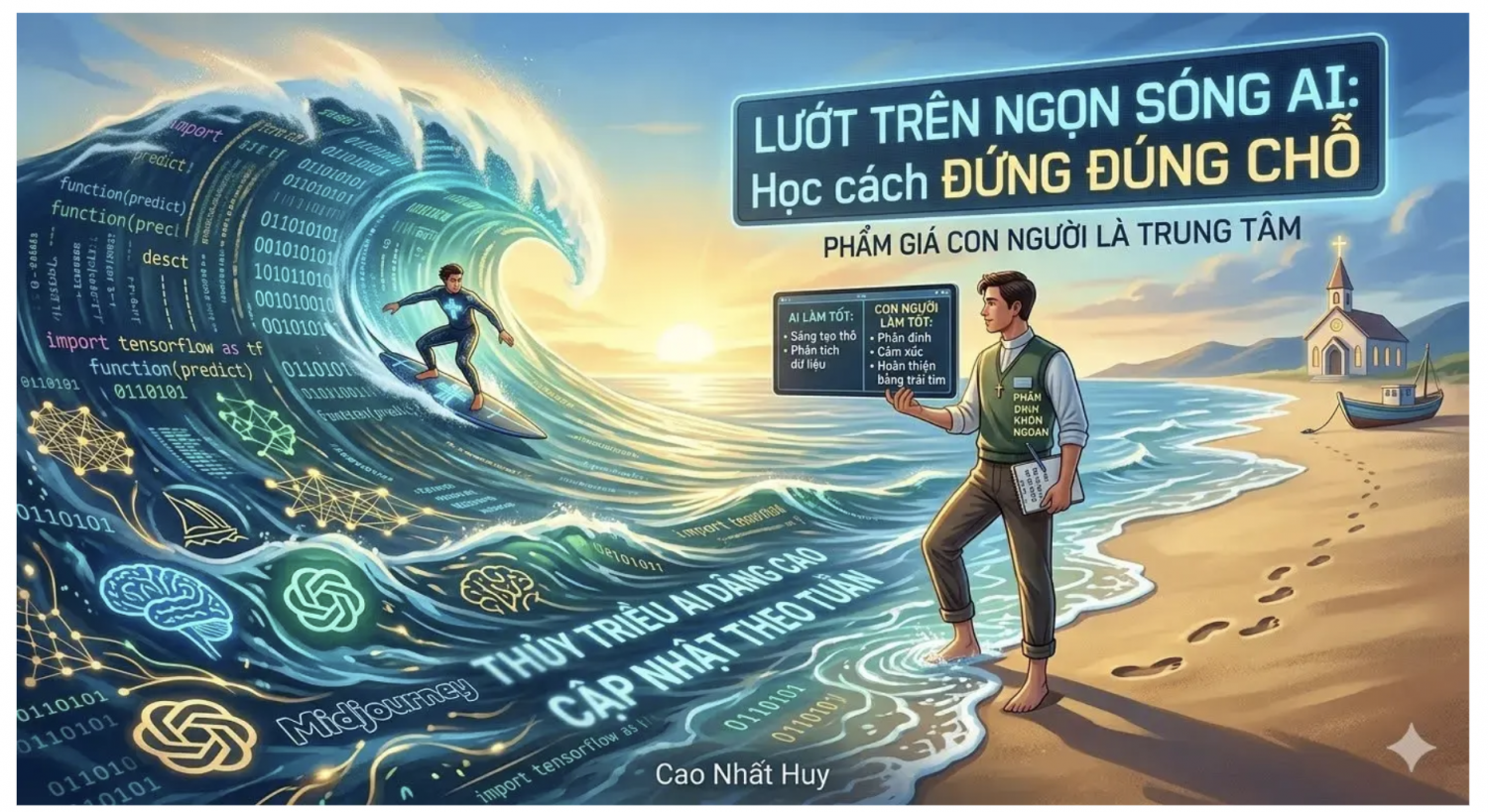 Vậy nên xin nhớ điều này: nếu muốn không bị bỏ lại phía sau, chúng ta đừng đặt cho mình mục tiêu phải học hết mọi thứ. Hãy bắt đầu bằng việc thử nghiệm và tập đứng đúng chỗ trên mép sóng. Bởi vì trong một thế giới biến chuyển từng ngày, người khôn ngoan không phải là người sở hữu nhiều kiến thức nhất, mà là người biết chọn cho mình một chỗ đứng đúng – và đối với người môn đệ Chúa Kitô, “chỗ đứng đúng” ấy luôn là nơi có sự phân định dẫn đường, và là nơi phẩm giá con người vẫn được đặt ở vị trí trung tâm.
