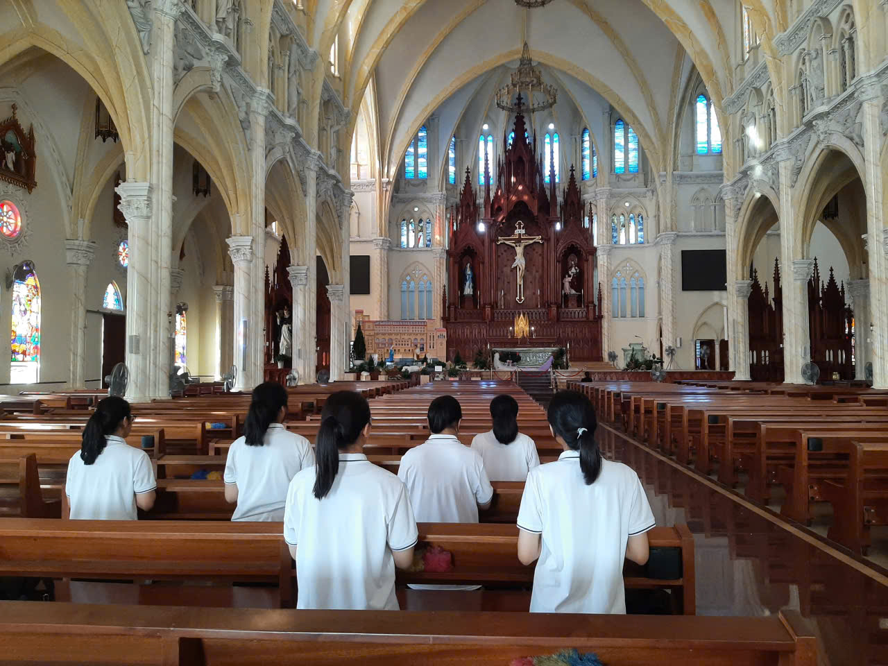 Điểm dừng chân đầu tiên là nhà thờ Song Vĩnh – ngôi thánh đường lớn nhất Vũng Tàu. Khi bước vào không gian rộng lớn và trang nghiêm ấy, tôi cảm nhận rõ sự bé nhỏ của mình trước Thiên Chúa. Nhưng chính lúc ấy, lòng tôi lại rộng mở. Trong thinh lặng cầu nguyện, tôi dâng lên Chúa những ước nguyện đơn sơ, xin Người dẫn dắt tôi trên hành trình ơn gọi còn nhiều chông chênh. Trong sự thinh lặng ấy, tôi cảm thấy Chúa đang dịu dàng chạm đến tâm hồn, nhắc tôi rằng mỗi bước chân theo Người, dù nhỏ bé, cũng được Người nâng đỡ và dẫn bước.