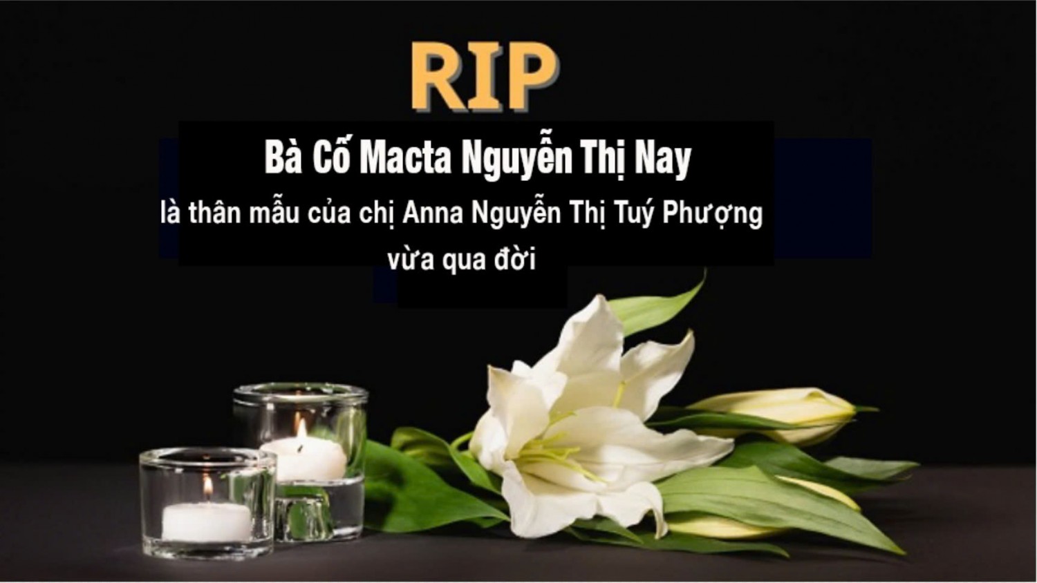 Kính báo: Bà Cố Macta Nguyễn Thị Nay, thân mẫu của chị Anna Nguyễn Thị Tuý Phượng (phục vụ cộng đoàn Nhà Mẹ), mới qua đời Inbox
