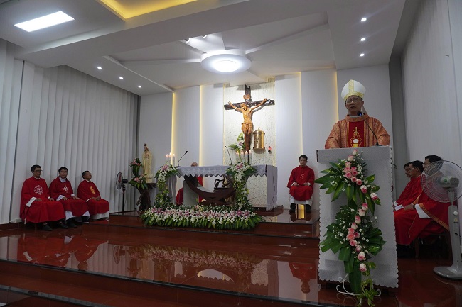 Trong bài giảng lễ, dưới ánh sáng Lời Chúa: Ds 21, 4-9; Pl 2, 6-11; Ga 3, 13-17, cộng đoàn hiểu được ý nghĩa cao cả của ngày lễ hôm nay. Qua bài chia sẻ Lời Chúa, Đức cha chủ tế mời gọi cộng đoàn cùng nhìn về ý nghĩa cao đẹp của Mầu Nhiệm Thập Giá và cùng tôn vinh Thánh Giá là biểu trưng cho Sự Cứu Độ. Nơi đó “ Thập Giá Đức Kitô” đã được tiên báo ngay từ thời Cựu Ước khi dân Israel bất trung, phản bội, hối lỗi và được cứu qua hình ảnh “ con rắn đồng” được treo lên. Con rắn đồng, hình ảnh của nhân loại tội lỗi, sự chết, nhưng nay đã trở thành biểu tượng của lòng khoan dung tha thứ của Thiên Chúa qua hình ảnh của Đức Kitô nơi Tân Ước, Thập Giá trở thành con đường cứu độ bởi chính Đức Kitô. Mầu Nhiệm Thập Giá còn được diễn tả qua thái độ khiêm hạ, tự huỷ mình ra không của Đức Giêsu. Ngài chấp nhận thân phận của tội nhân, chịu đóng đinh trên Thập Giá, chấp nhận một sự tự huỷ đi xuống chỗ tột cùng để nâng con người lên. Tình yêu của Ngài không bởi quyền năng nhưng chính sự vâng phục Chúa Cha, đã trở thành khuôn mẫu, phương thế cứu độ nhân loại.