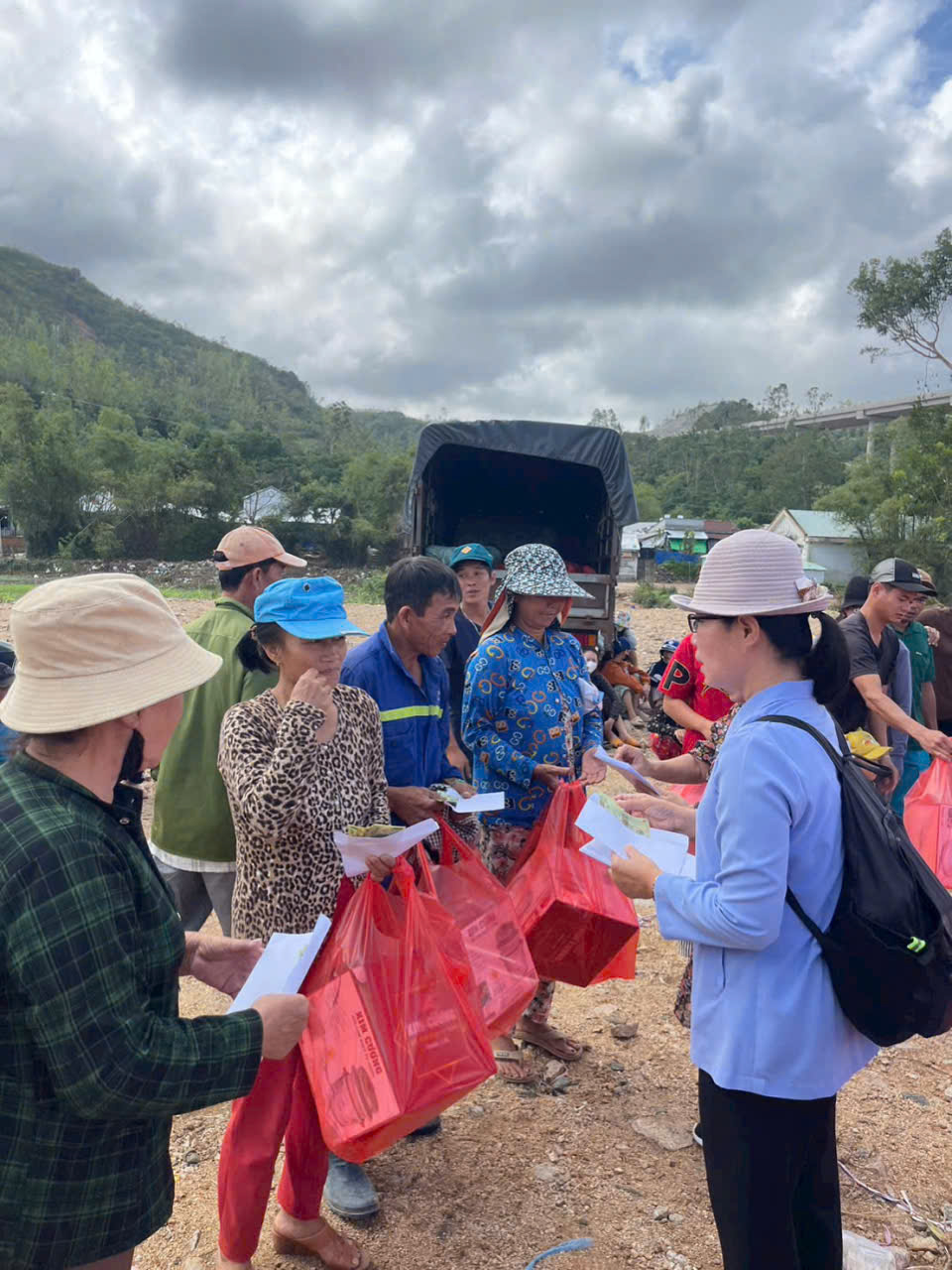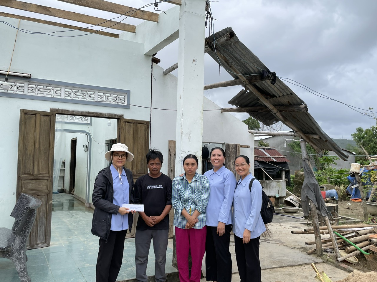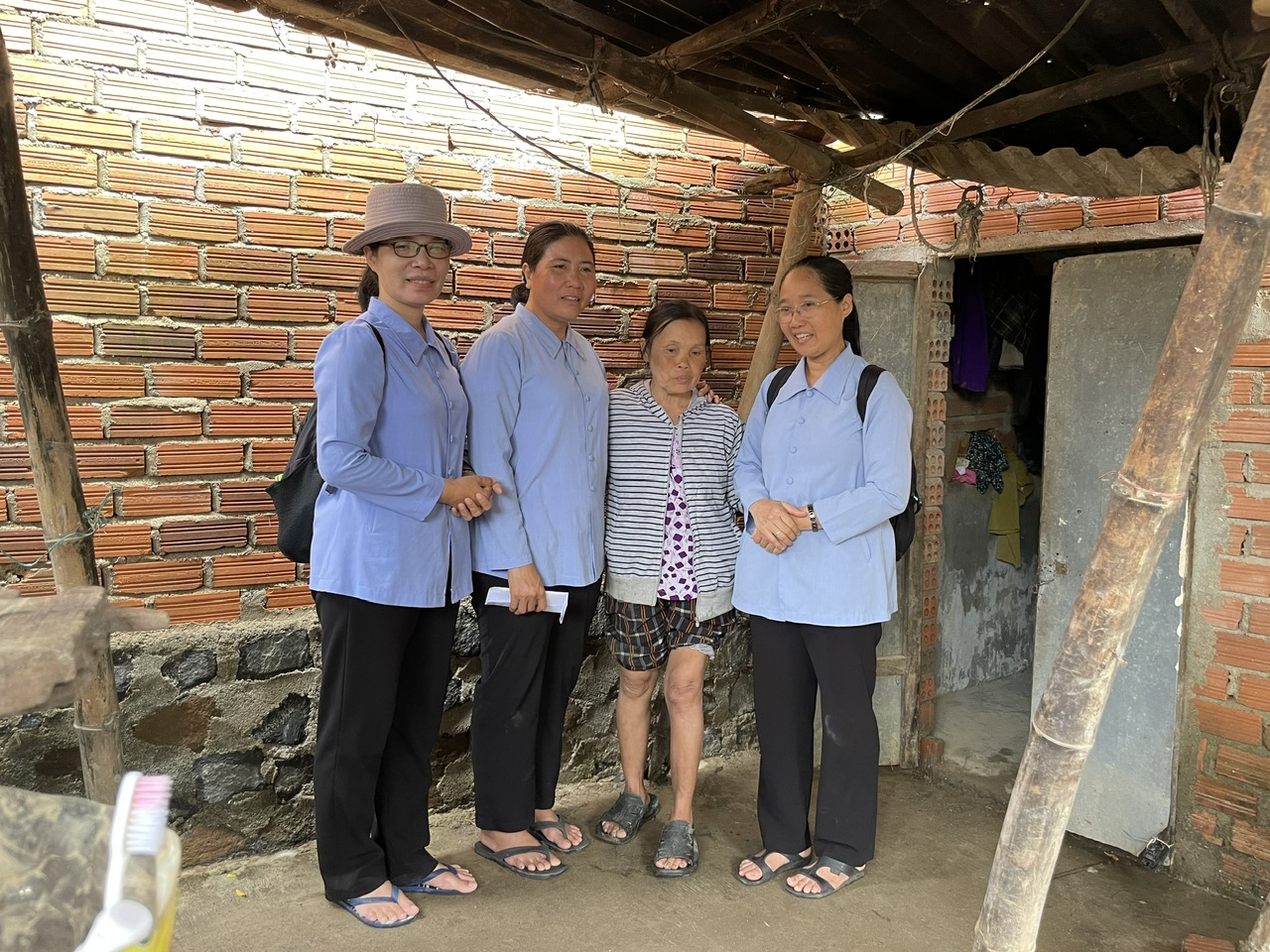 Sau Thánh Lễ sáng Chúa Nhật 14/12/2025, các chị em Dòng Mến Thánh Giá Qui Nhơn mang trong tim niềm vui muốn trao gởi, không điều kiện, lên đường men theo quốc lộ 1A, đến cầu Ngân Sơn (Tuy An) và rẽ phải đến thôn Long Hoà, xã An Định, huyện Tuy An, tỉnh Phú Yên (cũ). Chị em muốn đi sâu vào trong thôn để thăm hỏi, lắng nghe bà con chia sẻ về những nỗi niềm sau cơn bão lũ kinh hoàng vừa qua, sau khi đã có dịp được chia sẻ với họ những phần quà yêu thương vào những ngày trước đó. Trên đường đi chị em gặp chị Hồng (người dân trong thôn đang đi tìm rau về nấu cho bò), được chị và một vài người dân trong thôn trò chuyện và chia sẻ tình hình trong thôn: các đoàn cứu trợ, những thiệt hại về nhà cửa, mất mát tài sản, hoa màu, vật nuôi, cây trồng…, nhất là những gia đình có người thân bị thiệt mạng vì bị nước cuốn trôi và sạt lở, đất đá đè chết người… Những lời hỏi thăm ân cần của chị em, giây phút lắng nghe chia sẻ dù họ không biết chị em là ai, nhưng trong thái độ ân cần không dè dặt, thân thiện và gần gũi của cả đôi bên khiến khoảng cách về ngôn ngữ, vùng miền, tôn giáo được rút ngắn, dường như mọi người đã quen nhau từ lúc nào. Tuy không giúp cho người dân nhiều về vật chất, nhưng chính sự hiện diện, thăm hỏi, lắng nghe cũng như lời hứa cầu nguyện của chị em, đã phần nào là nguồn khích lệ, động viên cho anh chị em vượt qua sợ hãi và đau buồn.