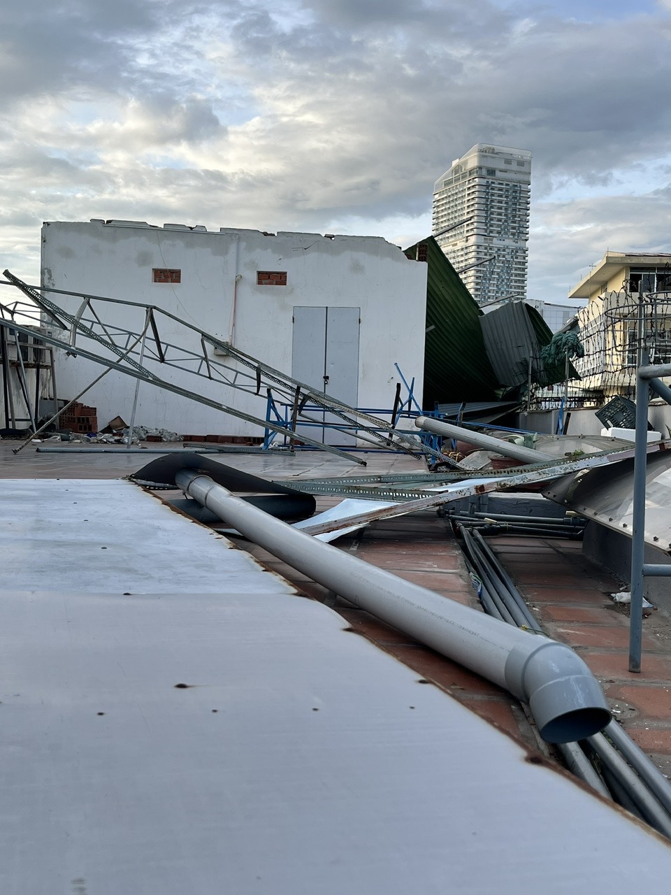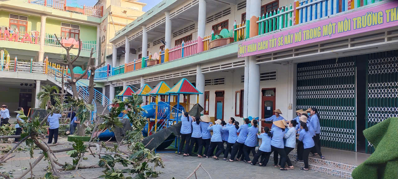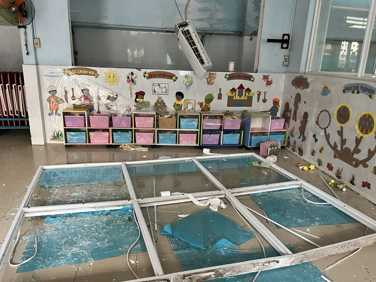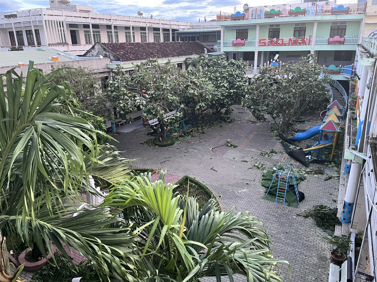 Khu vực trường Mầm non Sao Mai, sức gió mạnh luồn vào lớp Mầm 4 làm rơi máy lạnh, cửa kính vỡ, vách ngăn giữa nhà vệ sinh và lớp học sập hoàn toàn. Một số phòng học khác các cửa kính bị vỡ nhiều. Các cây xanh và cảnh quan sân trường trở nên hoang tàn sau cơn bão.