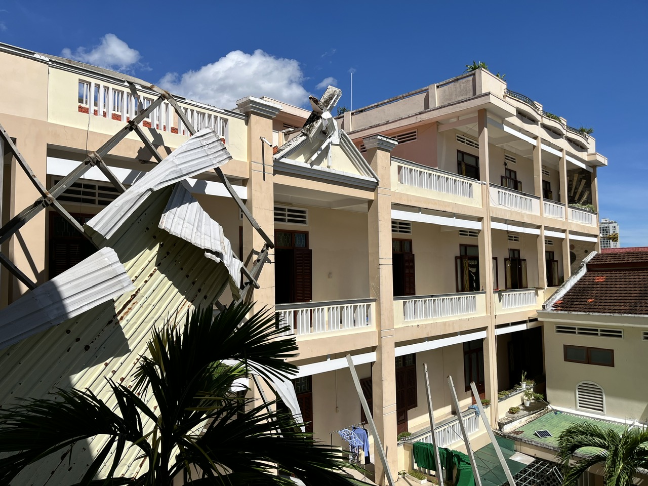 Về khu vực nhà của Khấn sinh, các phòng có nguy cơ sụp vách, bay mái nên đã đi chuyển đến các vị trí an toàn khác. Một số nơi như Nhà nguyện, phòng họp, máy điều hòa sập, vỡ các cửa kính, vách cầu thang máy bị cơn lốc đánh bung ra nguyên tảng, phòng chị Tổng Phụ trách la phông trần nhà bị bốc lên. Khi sức gió ở vào mức cao điểm cũng đã thổi và đánh sập cánh cửa sắt ở Sảnh, nơi để các xe lớn, làm trầy xướt chiếc xe ô tô 7 chỗ.