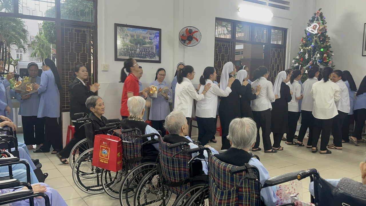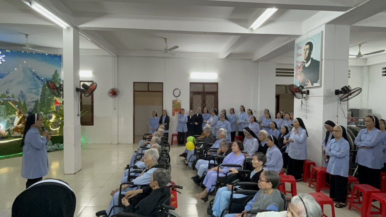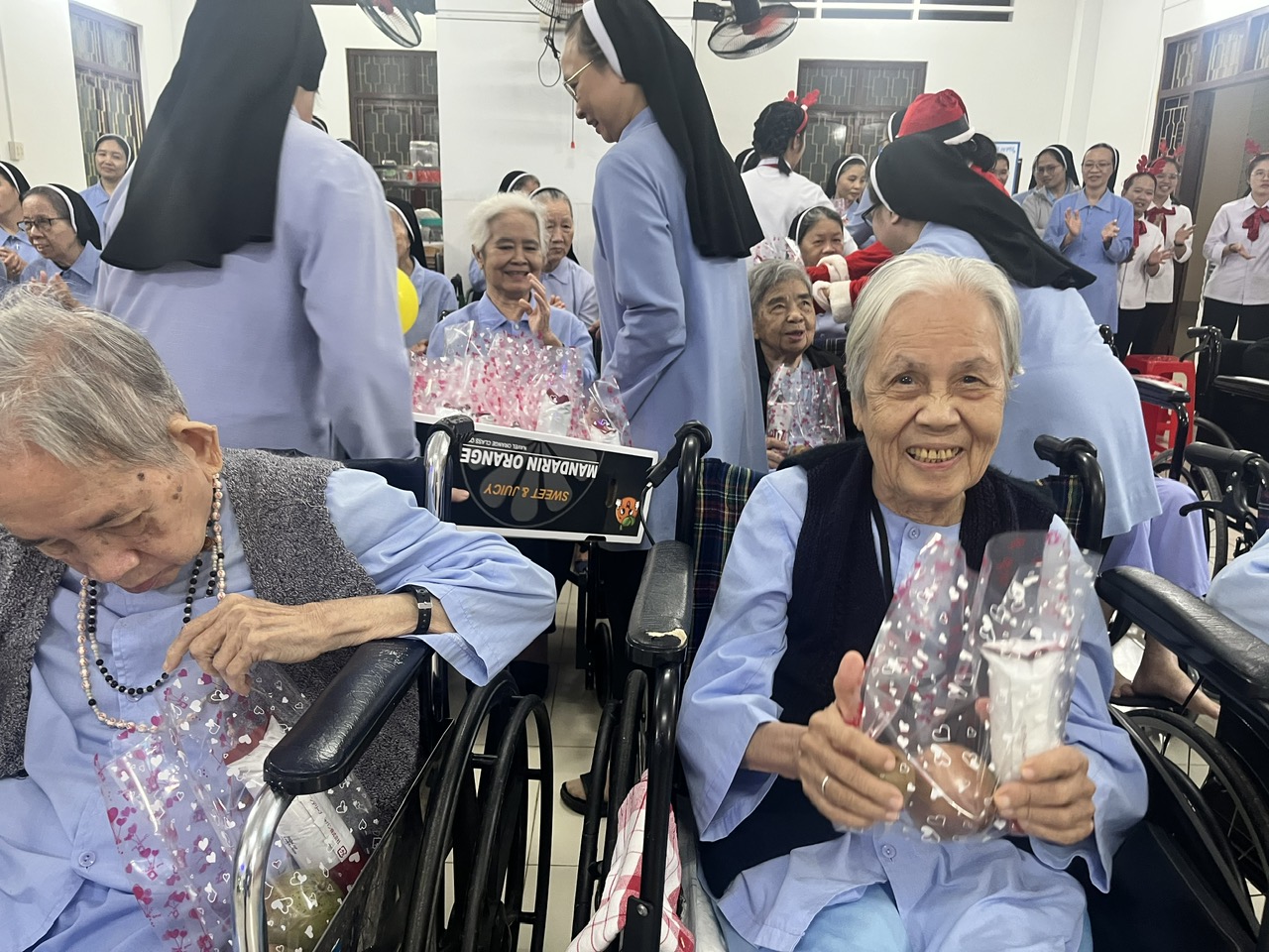 Chiều Chúa Nhật 21/12/2025,  sau giờ kinh chiều, chị em Khấn sinh cộng đoàn Nhà Mẹ cùng các em Thanh tuyển, Tiền tập, Tập sinh và quý chị trong Ban Điều hành Hội dòng đến chia sẻ niềm vui Giáng Sinh với quý bà hưu dưỡng và quý chị em phục vụ tại cộng đoàn Ghềnh Ráng.