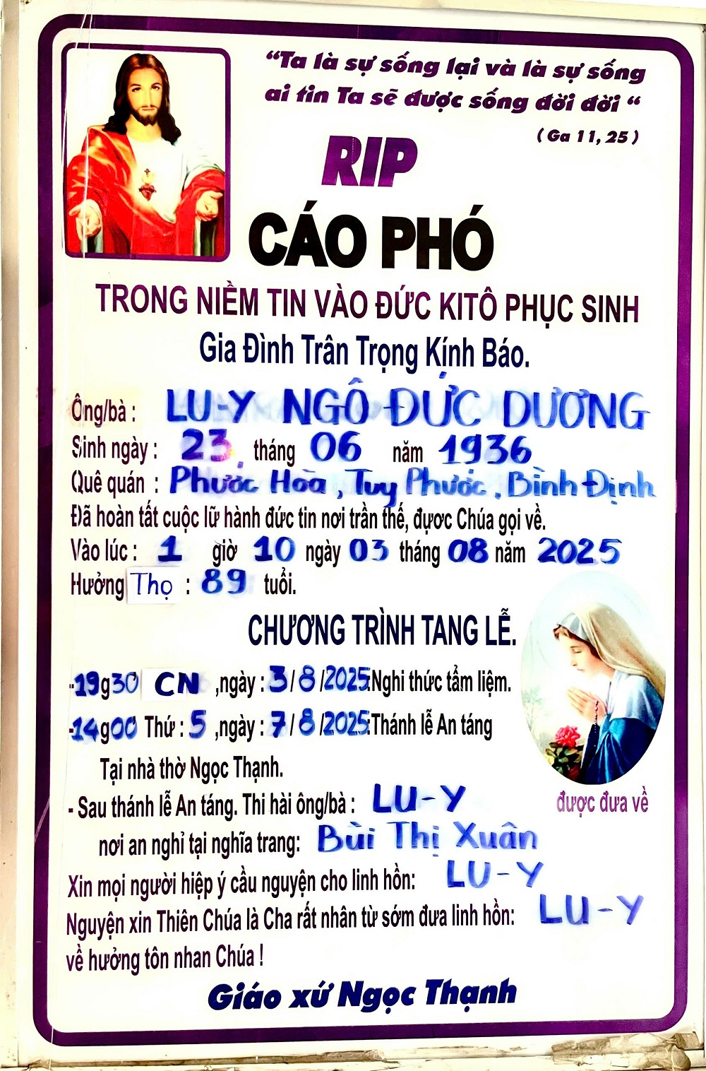 Tư gia, thuộc Giáo xứ Ngọc Thạnh  Giáo Phận Qui Nhơn